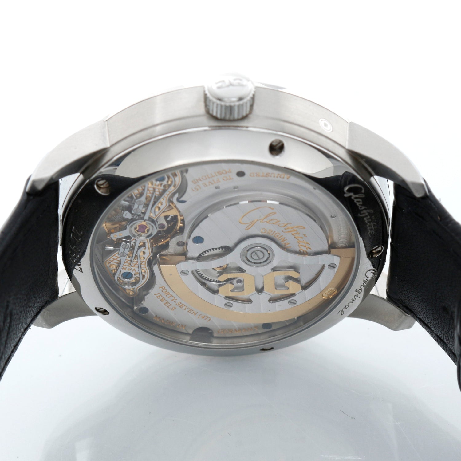 Glashütte Original PanoMaticLunar Men's Stainless Steel Watch w19002423261 - Automatic movement Caliber 90-02, Moonphase, Sub-second, big-date display, Sapphire exposition back. Senator Power Reserve Display. High polished bezel with satin finish stainless steel case (40mm). Silver dial. Glashutte strap with stainless steel Glashutte deployant clasp. Pre-owned with Glashutte box and papers, circa 2025.