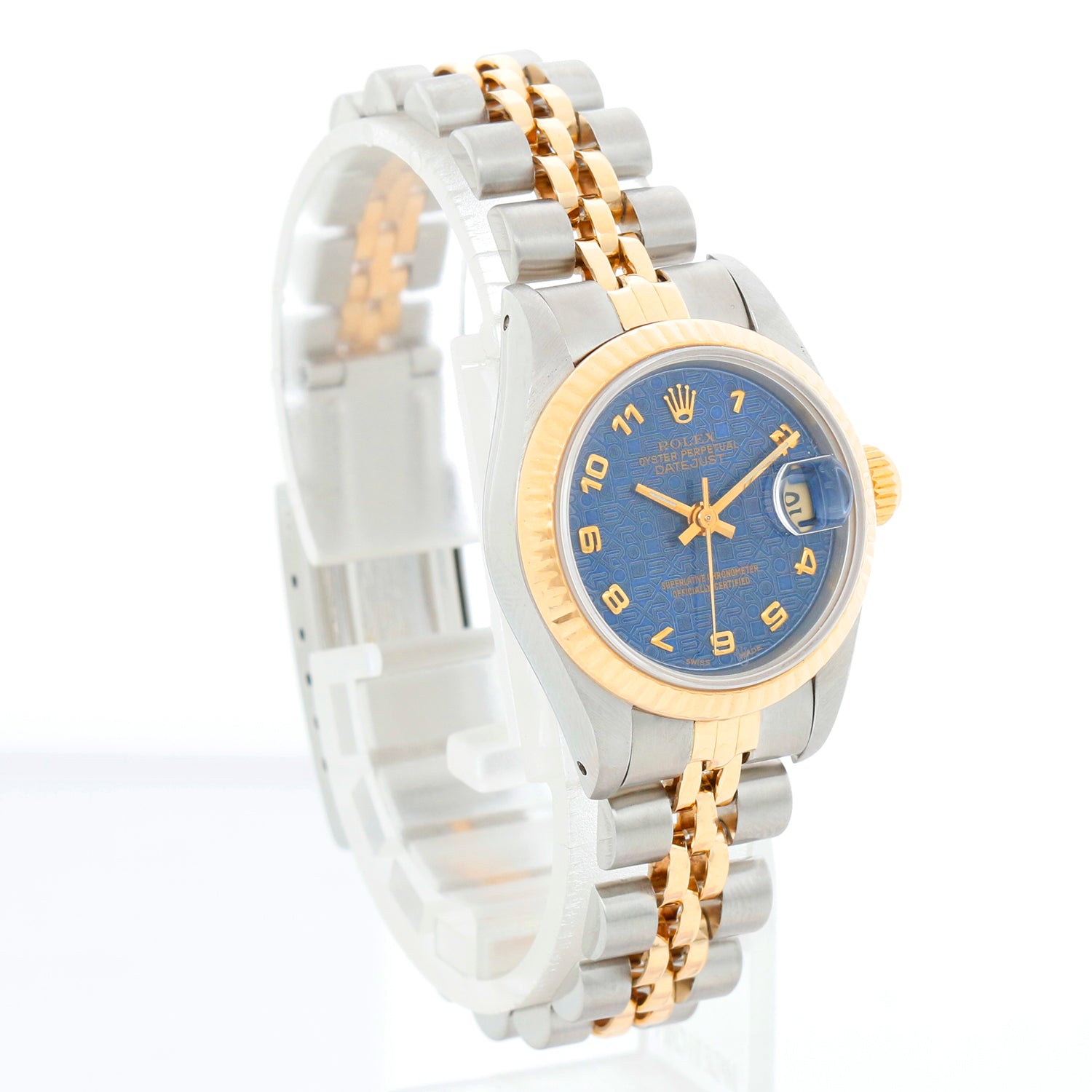 Rolex Ladies Datejust Steel & Gold Watch 69173 - Automatic winding. Datejust. Stainless steel case with Fluted bezel (26mm). Blue Arabic Jubilee dial. Stainless steel and 18k yellow gold Jubilee bracelet. Pre-owned with custom box.