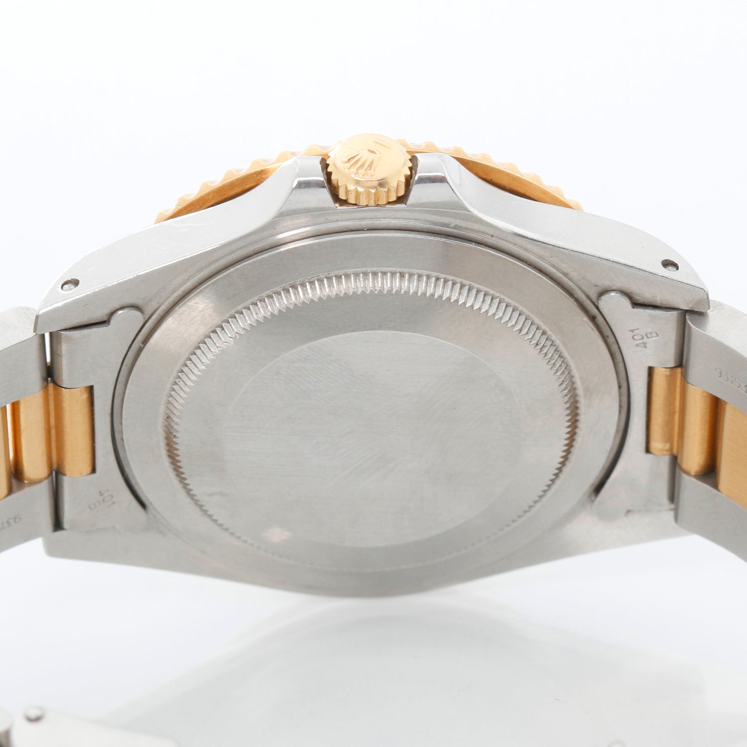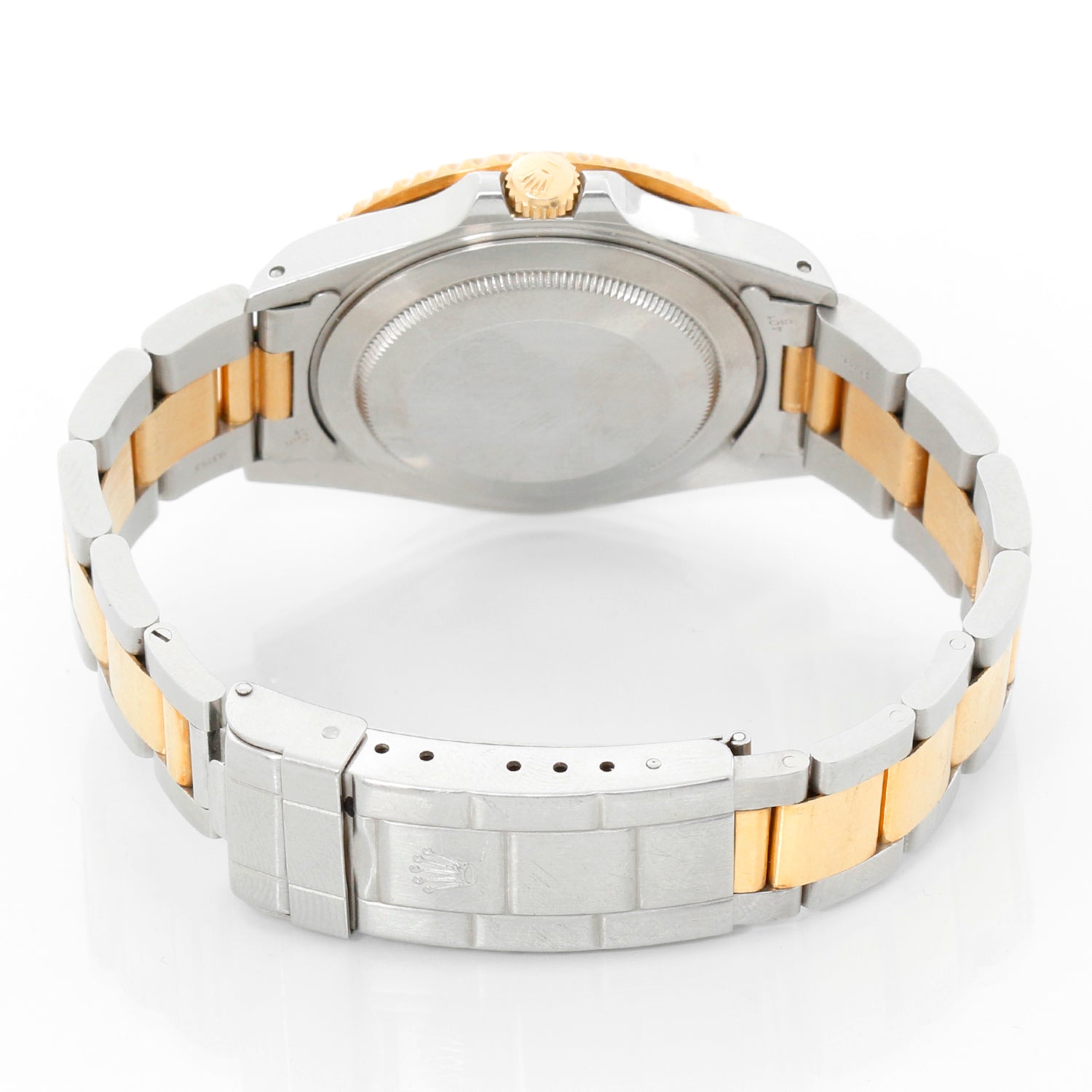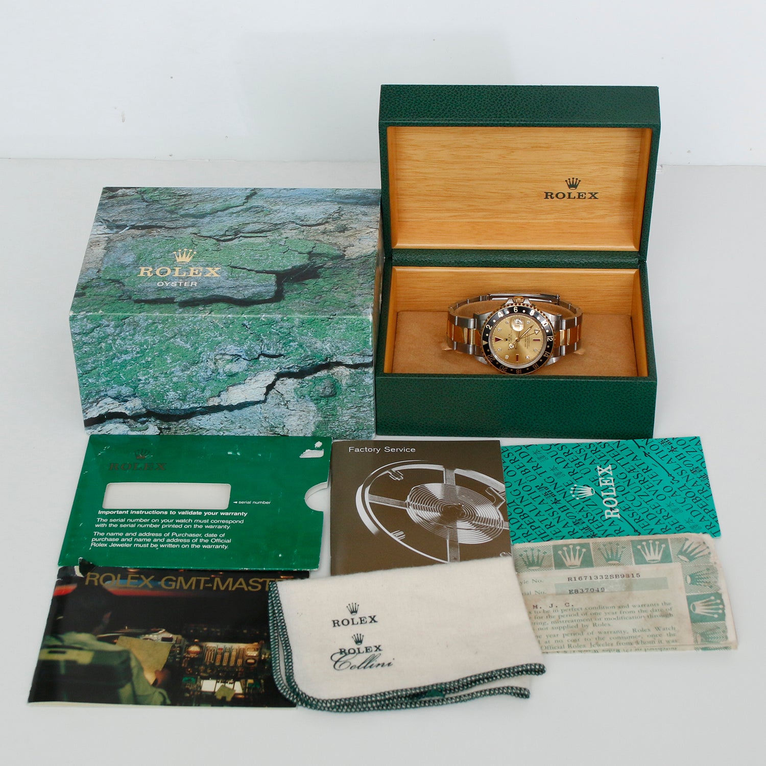 Rolex GMT-Master II 2-Tone Men's Watch 16713 with Ruby Serti Dial - Automatic winding, 31 jewels, Quickset, sapphire crystal. GMT-Master II. Stainless steel case with 18k yellow gold bezel (40mm diameter). Champagne Ruby serti dial. Very rare special order Submariner 9315 stainless steel & 18k yellow gold Oyster bracelet as specified on the original open papers. Pre-owned with Rolex box,open papers,books,and polishing cloth.Unpolished collector condition that can be polished at customers request. Early E series.