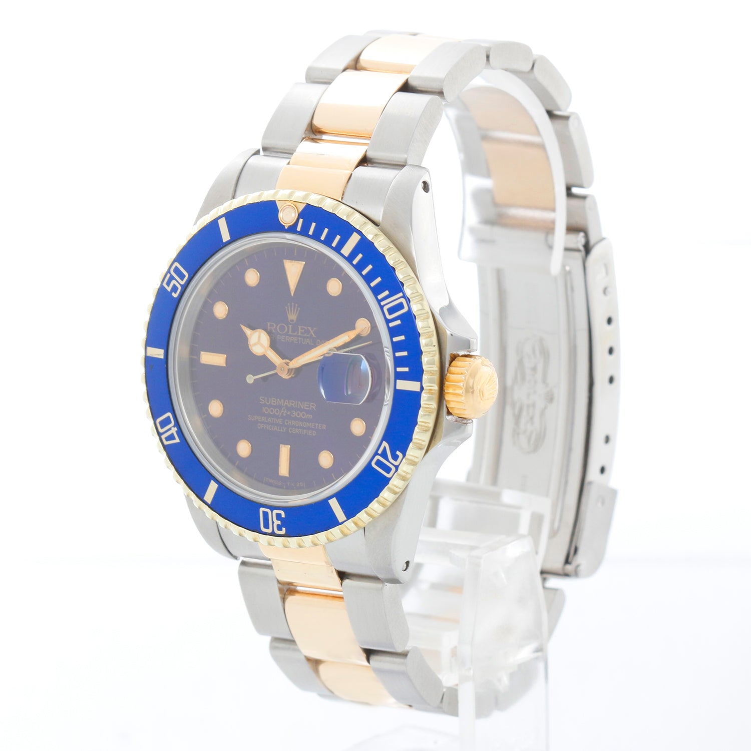 Rolex Submariner 2-Tone Steel & Gold Men's Watch Transitional Model 16803 - Automatic winding, 31 jewels. Submariner. Stainless steel case with 18k yellow gold bezel with blue insert (40mm diameter). Blue dial. Stainless steel and 18k yellow gold oyster bracelet. Pre-owned Rolex Travel box and book.