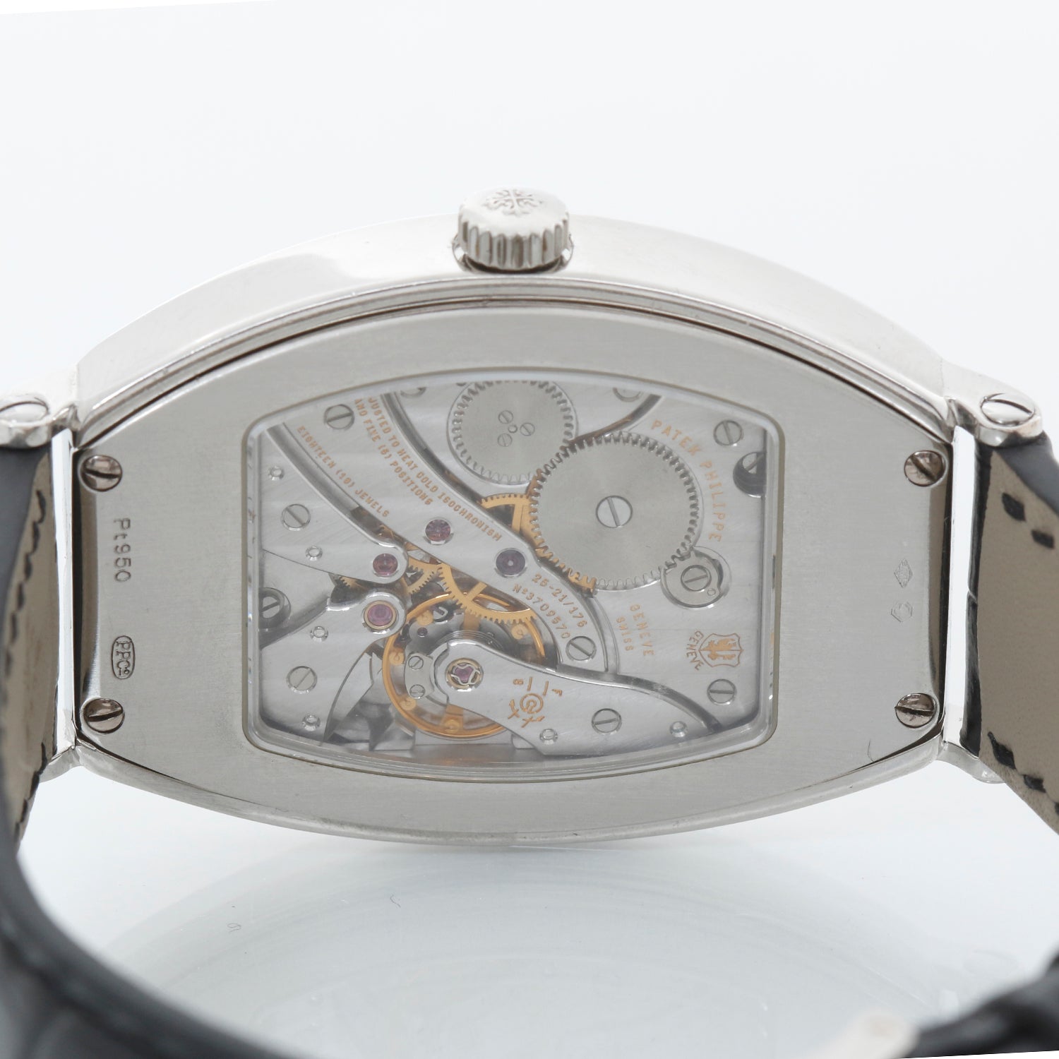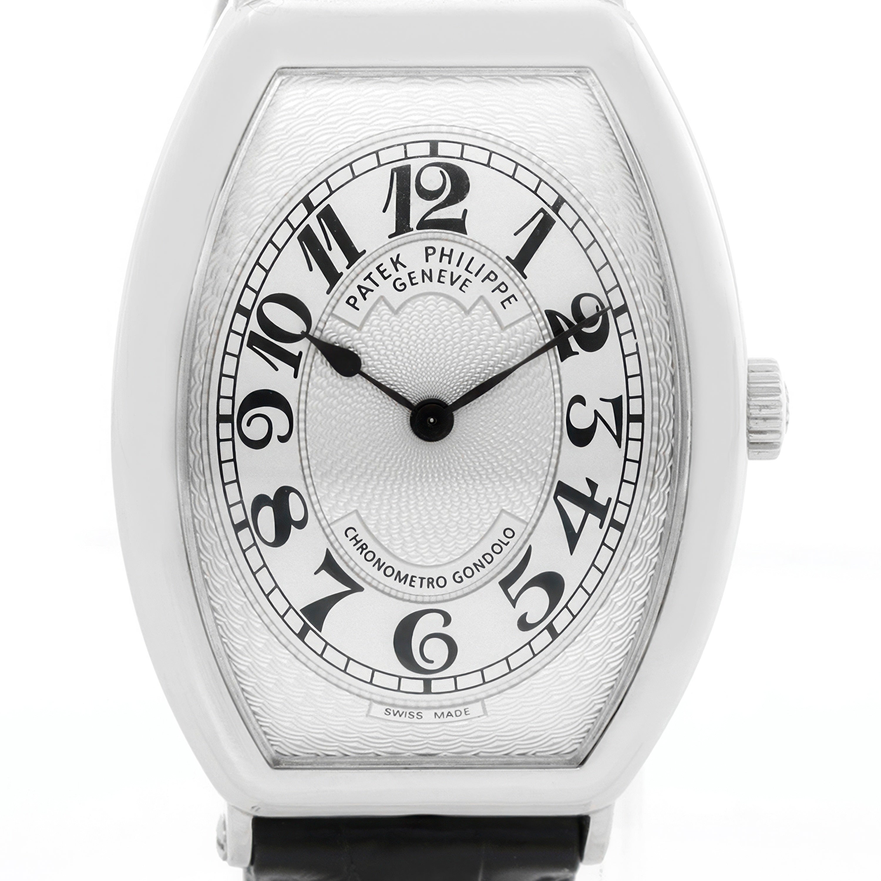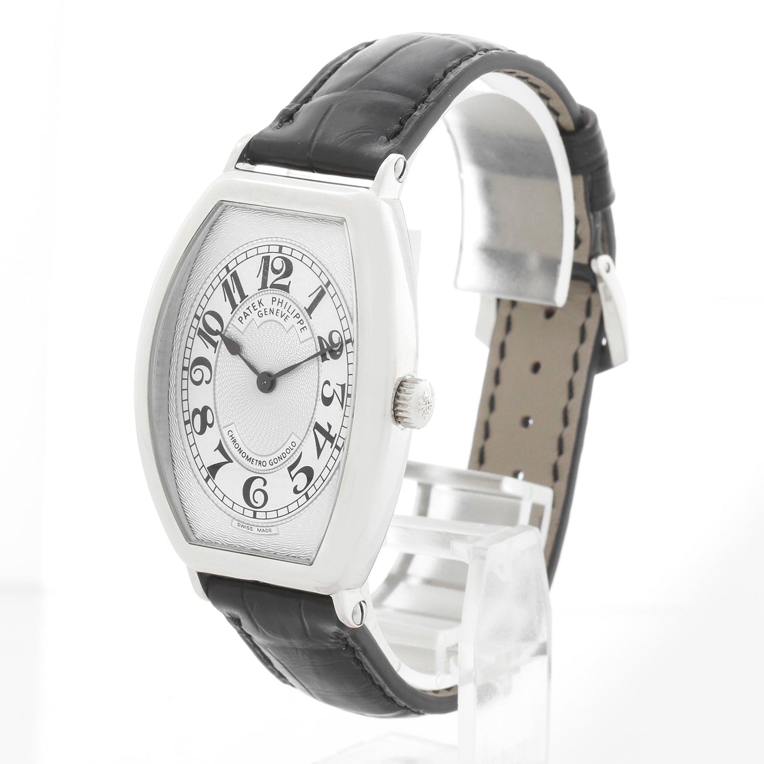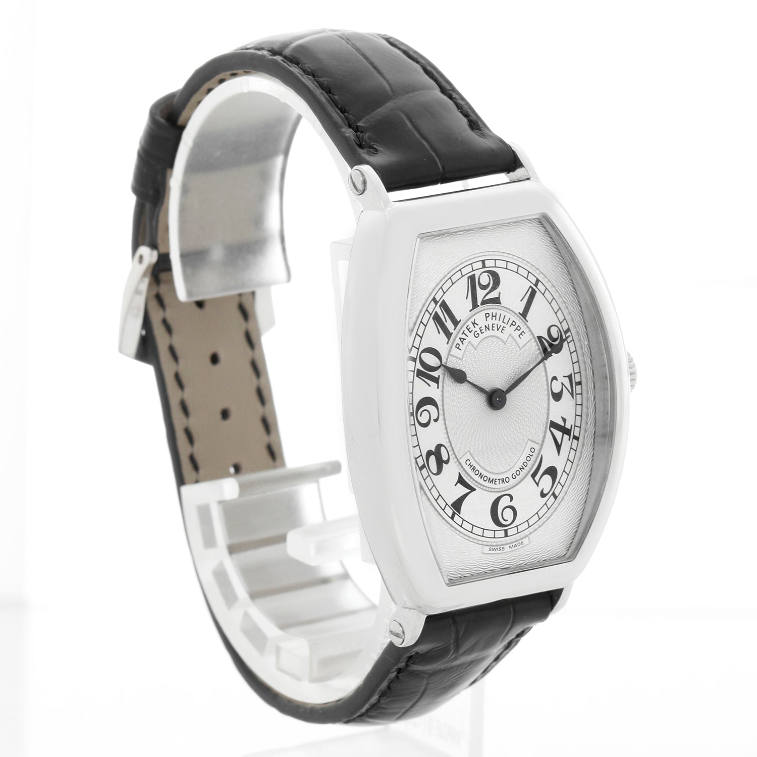 Patek Philippe Chronometro Gondolo Platinum Men's Watch 5098 P (or 5098P) - Manual winding. Platinum tonneau shaped case with exposition back (32mm x 50mm). Silver guilloche dial with black Arabic numerals. Black Patek Philippe strap band and Patek Philippe platinum buckle. Pre-owned with Patek Travel box .