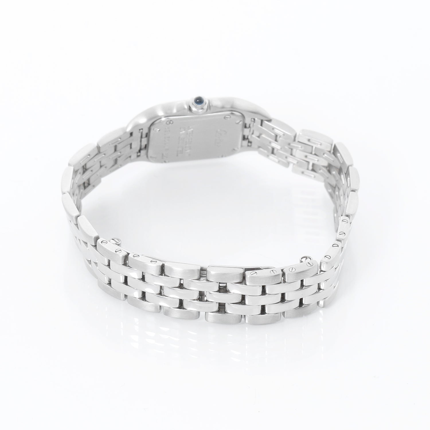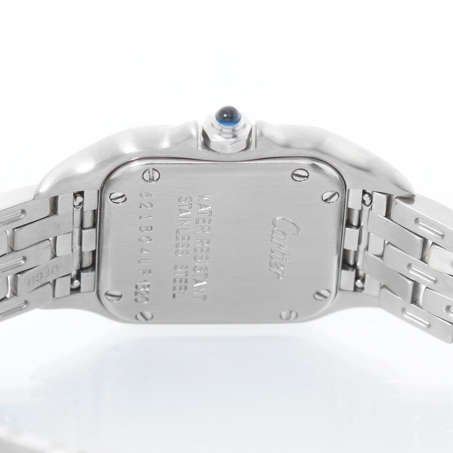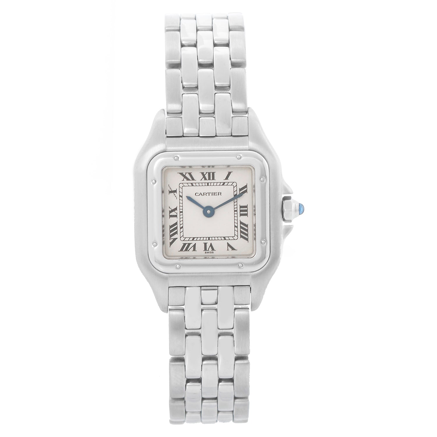 Cartier Panther Ladies Stainless Steel Watch W25033P5 1320 - Quartz. Panther or Panthere. Stainless steel case (21mm x 30mm). Ivory colored dial with black Roman numerals. Stainless steel Panthere bracelet; will fit up to a 6 1/4 inch wrist. Pre-owned with DeMesy box.