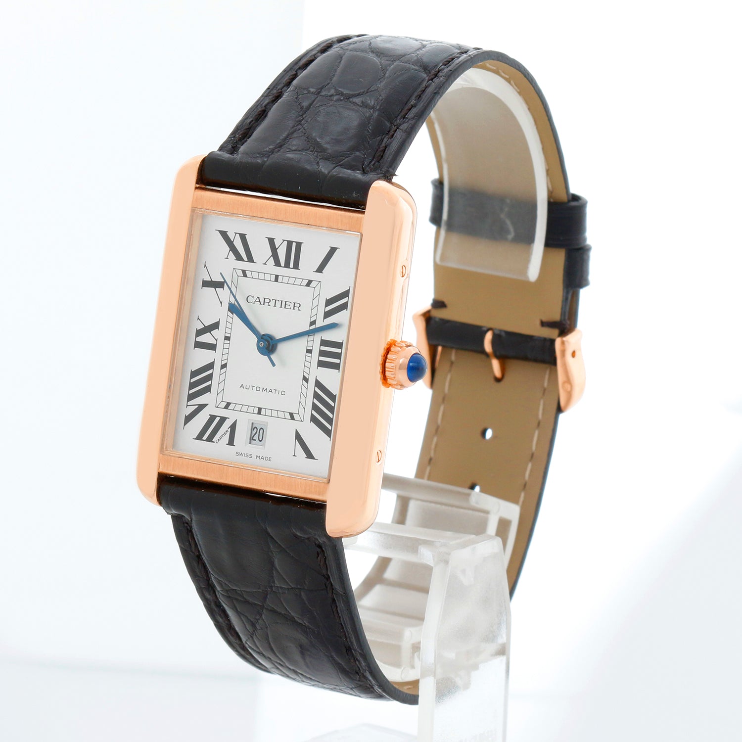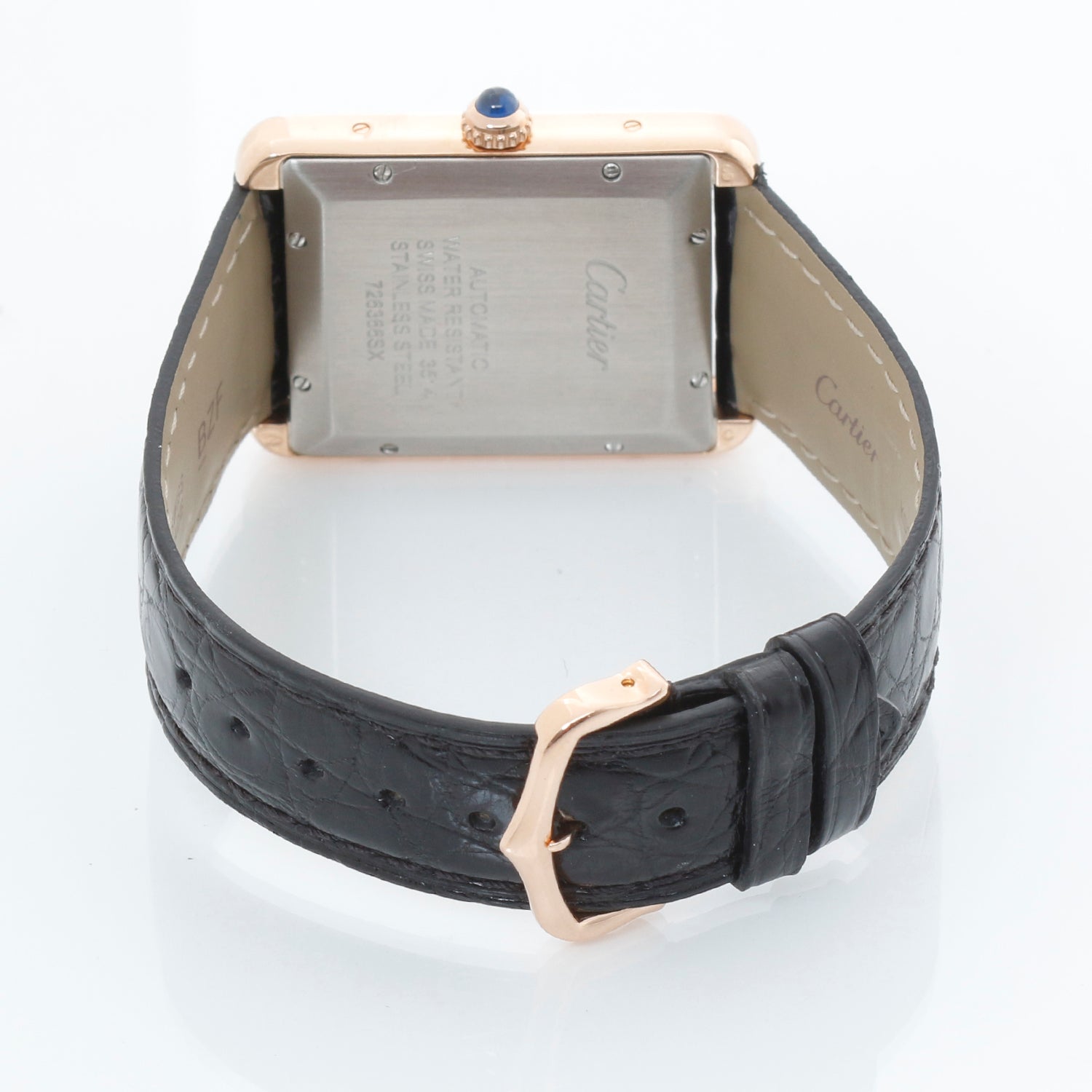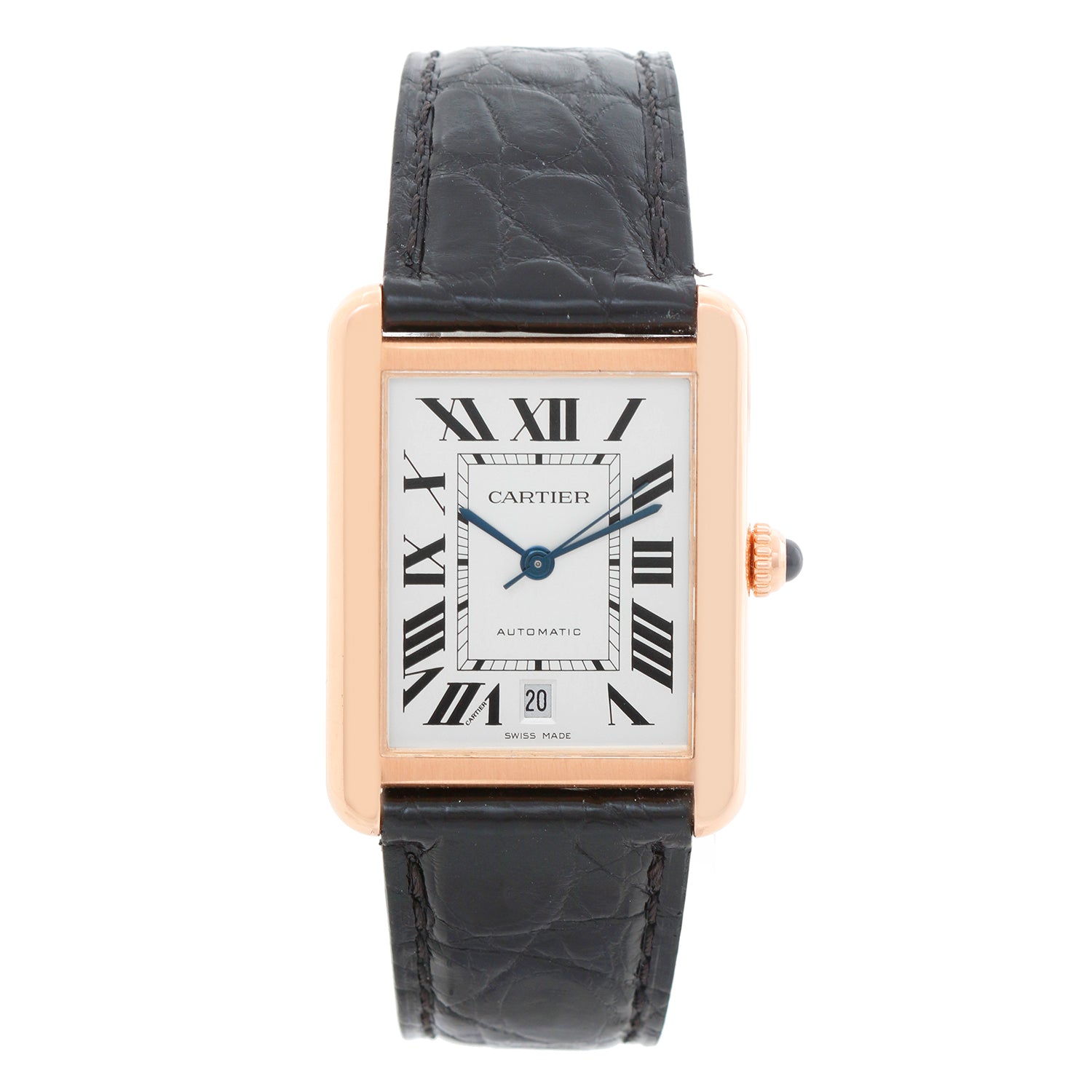 Cartier Tank Solo 18k Rose Gold & Stainless Steel XL W5200026 3514 - Automatic. Tank Solo. 18k rose gold case with stainless steel back  (31 x 41mm). Silver dial with black Roman numerals with date at 6 o'clock. Black Cartier strap with Cartier rose gold tang buckle. Pre-owned  with Cartier box and card. Not dated.